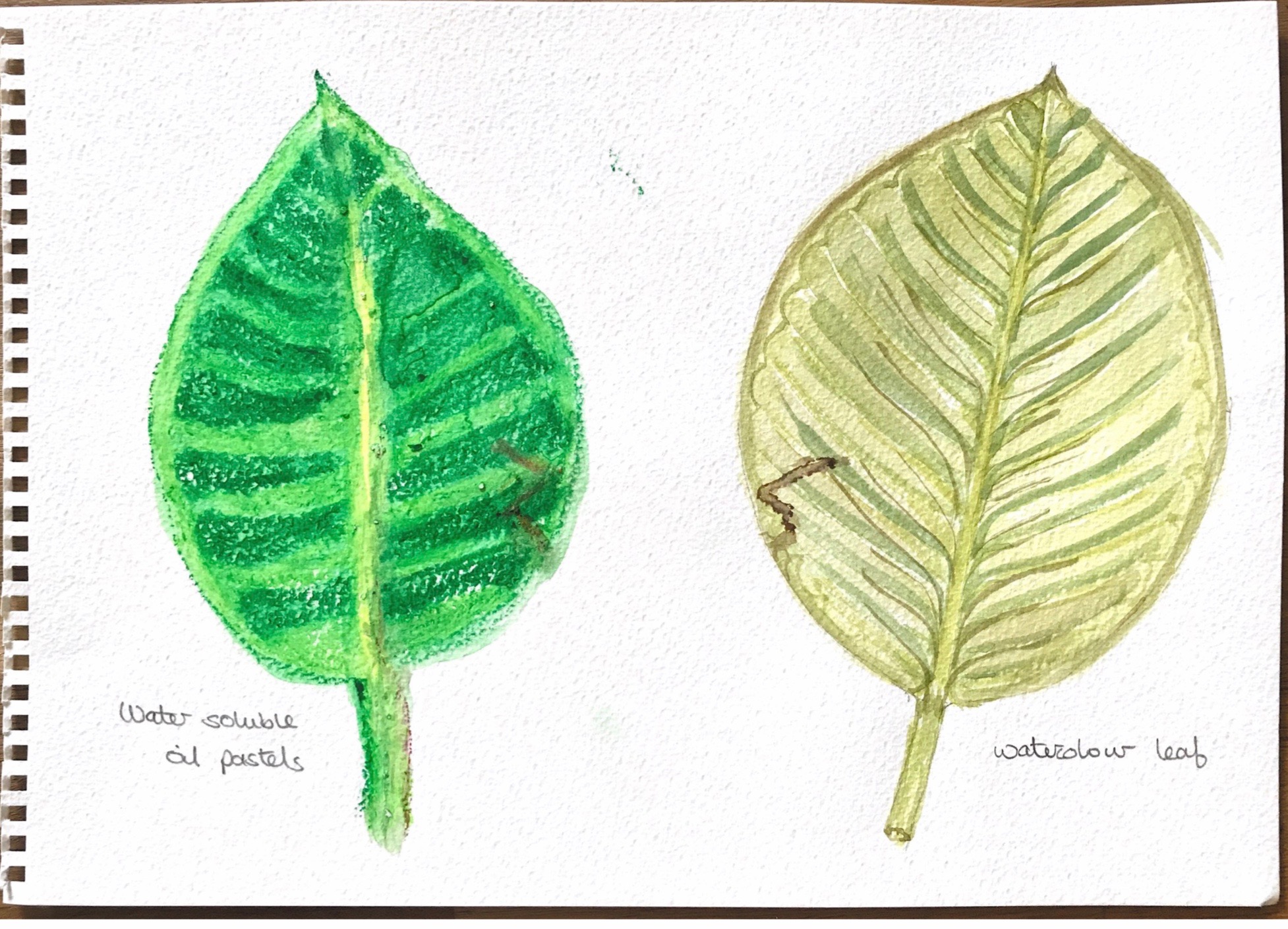 My observational drawings were mostly done with watercolour but I did also try water-soluble oil pastels for one leaf. I found this too strong, controlled and bold for my liking.