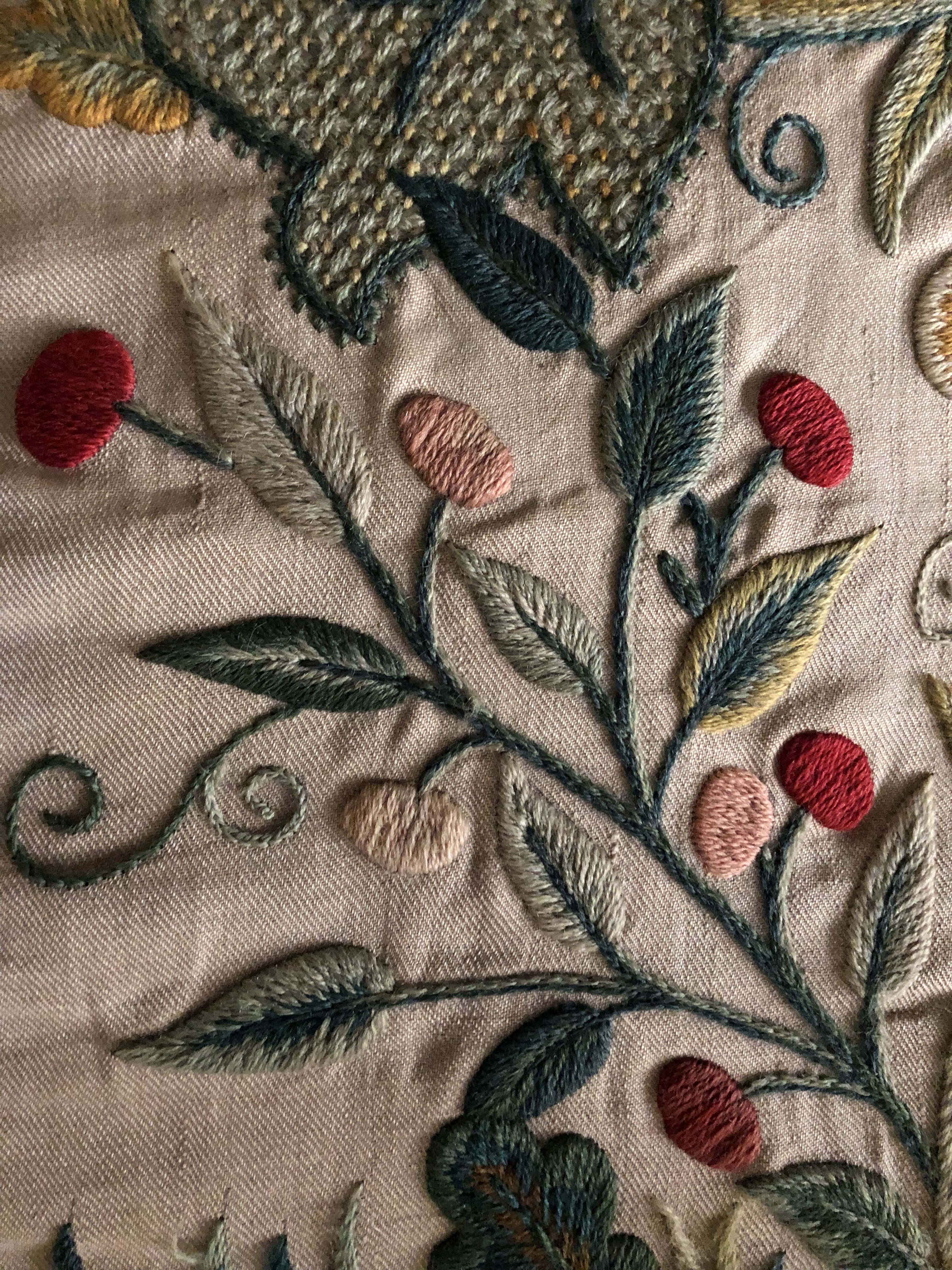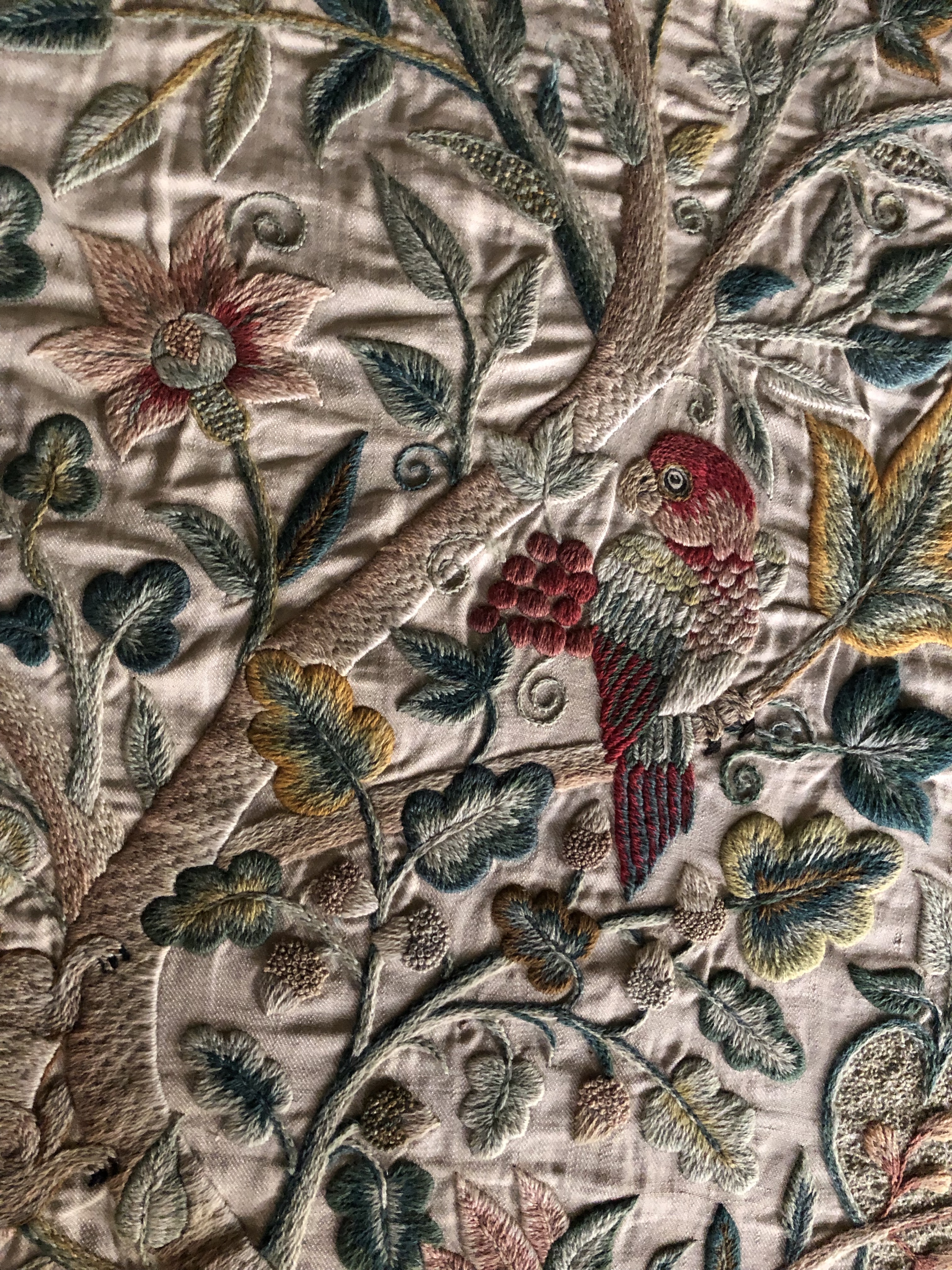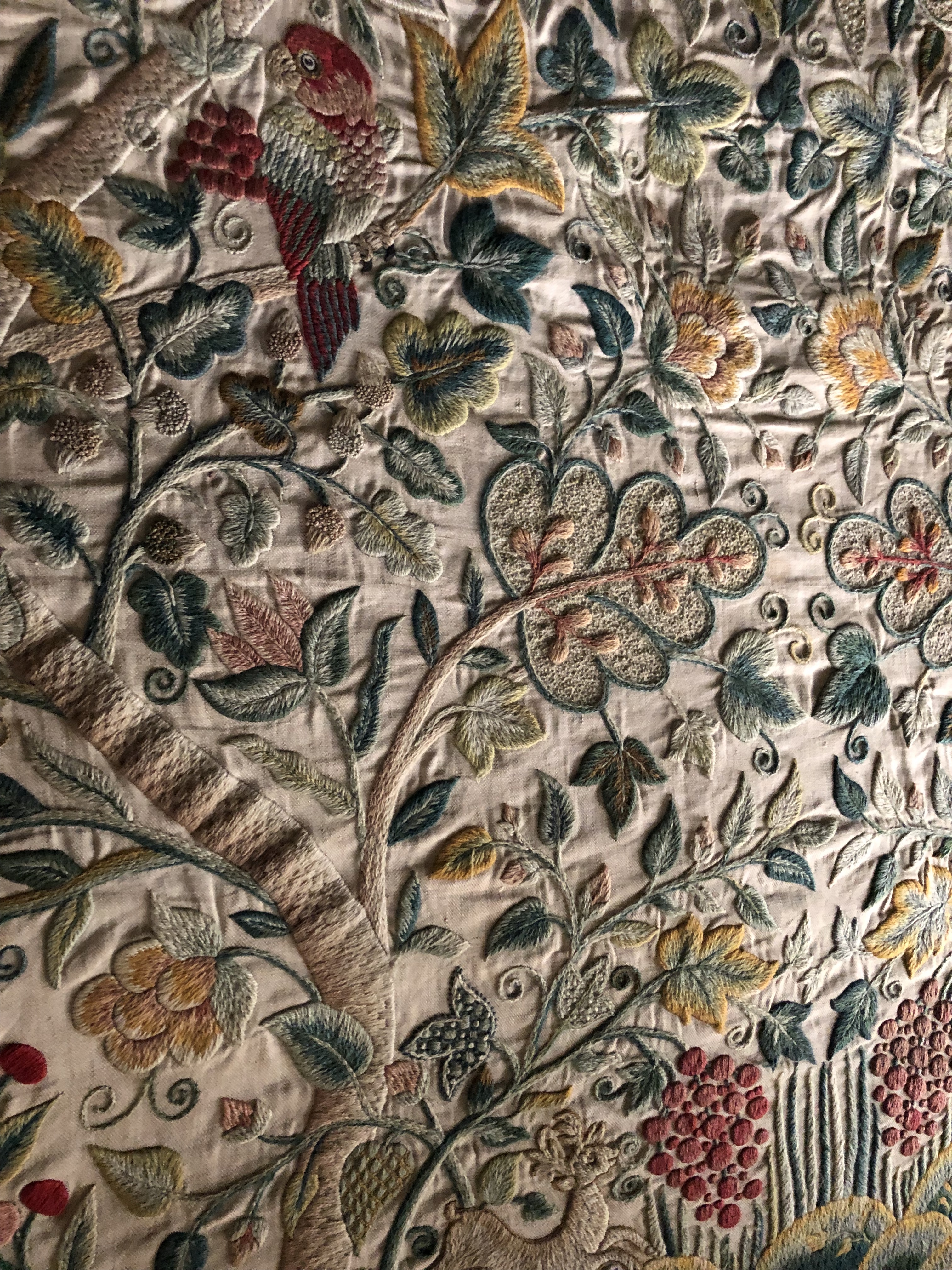 For the detailed picture of part of the ‘Tree of life bedspread I tried to capture the density of the stitching and used pressure to show the tones of the threads. The piece is very tactile and I tried to capture this in my drawing by showing the types of stitches – chain, satin, and stem stitch. The piece has been well cared for and shows no sign of wear and tear or of fading.