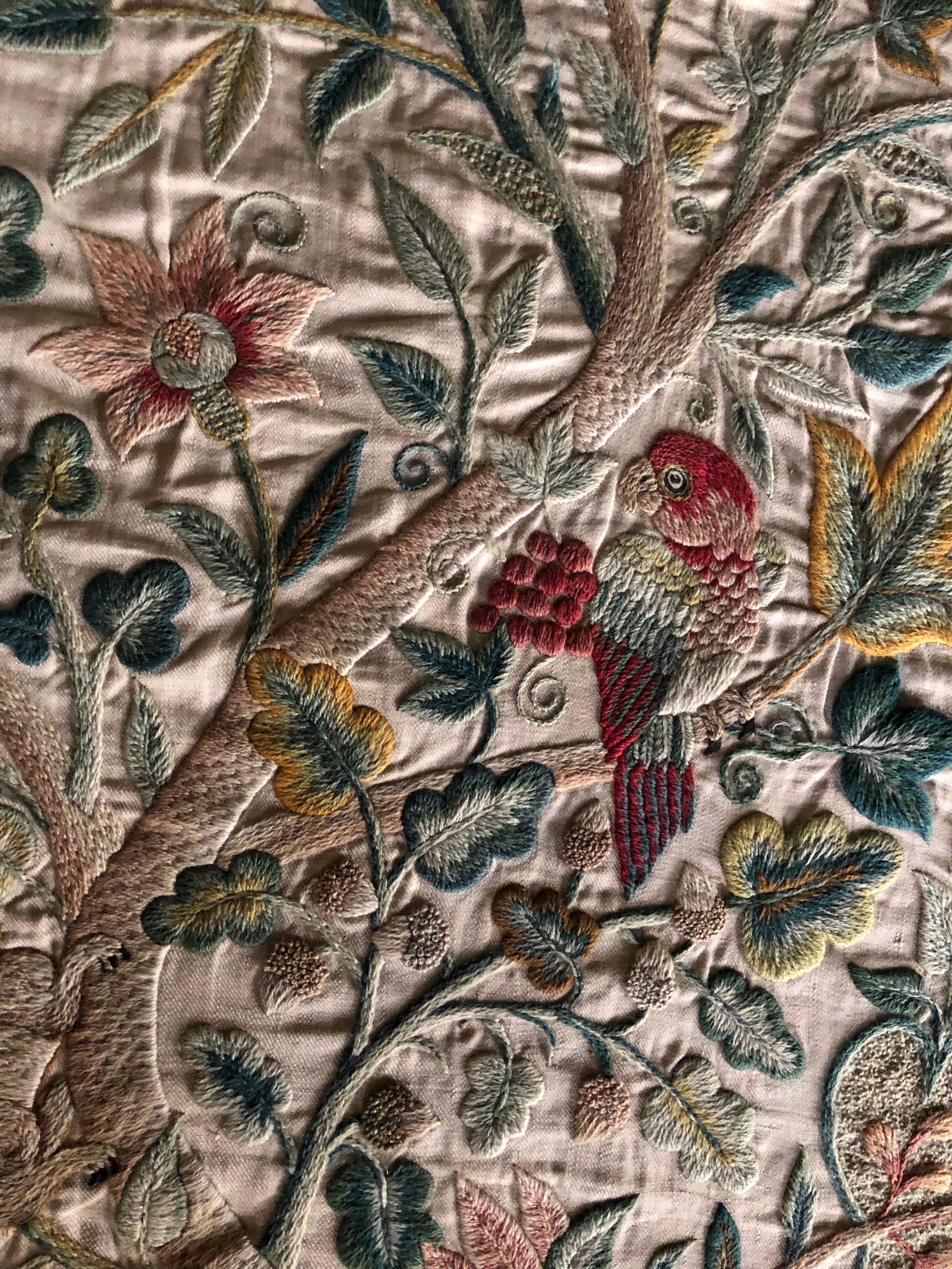 Jacobean crewel work used designs incorporating birds, flowers, animals, plants and the tree of life, and this piece includes these designs. Inspiration for these designs came from exotic fabrics imported by the English East India company in the 17th century, but due to lack of dyes, early crewel work was monochromatic until more varied dyes became available. By the time this piece was embroidered many colours would have been available and this can be seen in the variation of colour and tone in this piece.