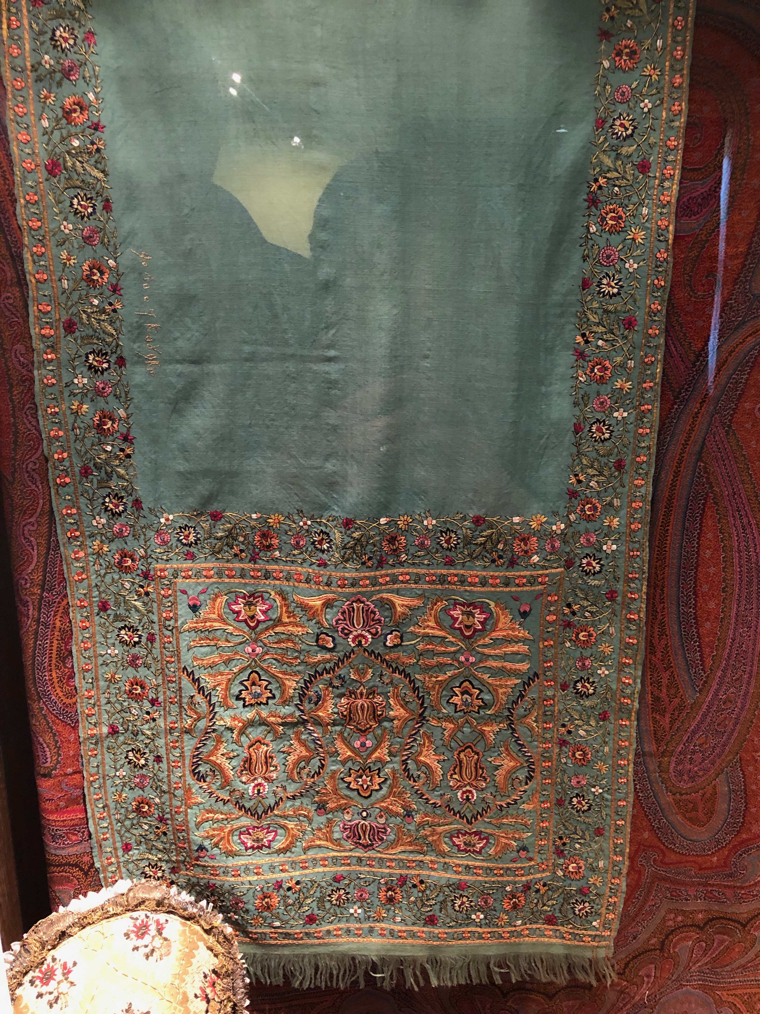 This stole would have been expensive due to the time taken to weave and embroider it and therefore would only have been available as an item for the very rich. It shows little sign of wear so maybe was kept for special occasions. It is bright and beautiful and I am very drawn to the colours of both the background and the embroidery.