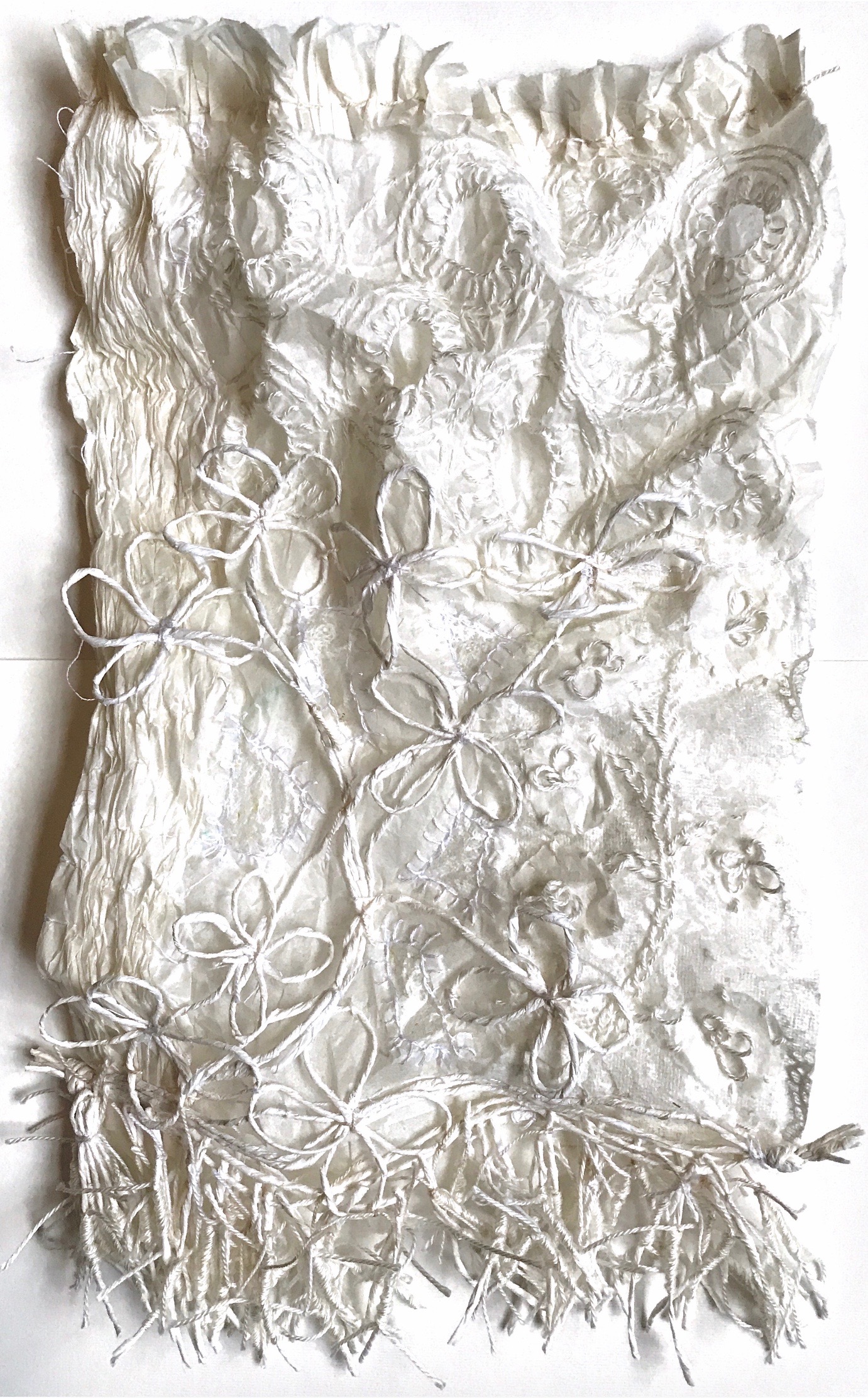 I was apprehensive about the paper manipulation but found this part really exciting. Parts of the drawings I had done could be isolated and these proved to be very inspiring when creating surfaces and stitching. I found it easier to work with paper than fabric as it retains its form and shape, and I particularly loved the delicacy of the fine papers when crumpled and softened to achieve drape and movement. There was a lot of satisfaction in stitching heavily into the fine papers without tearing them.