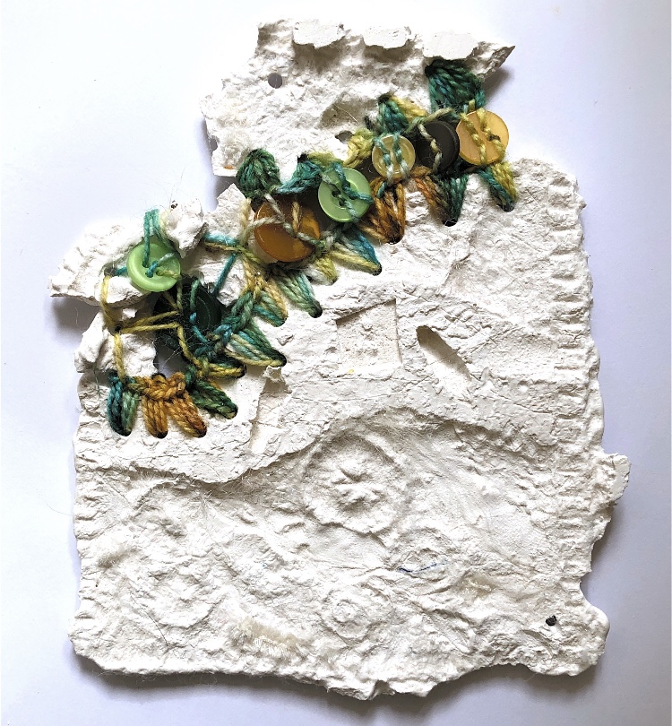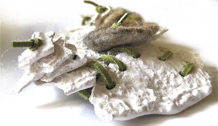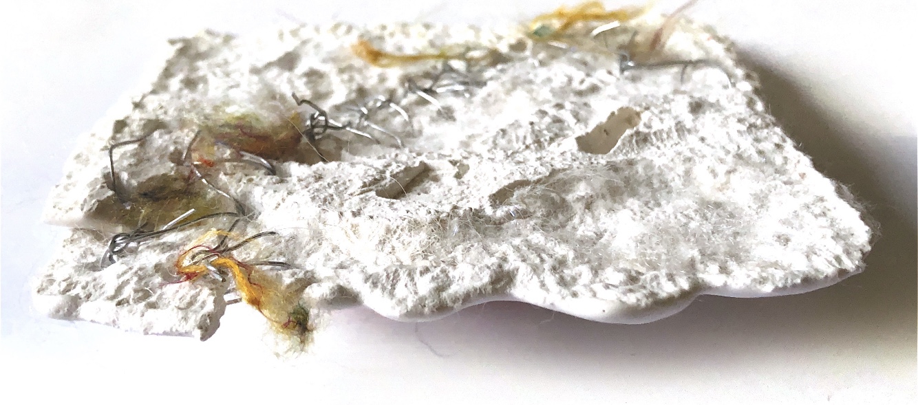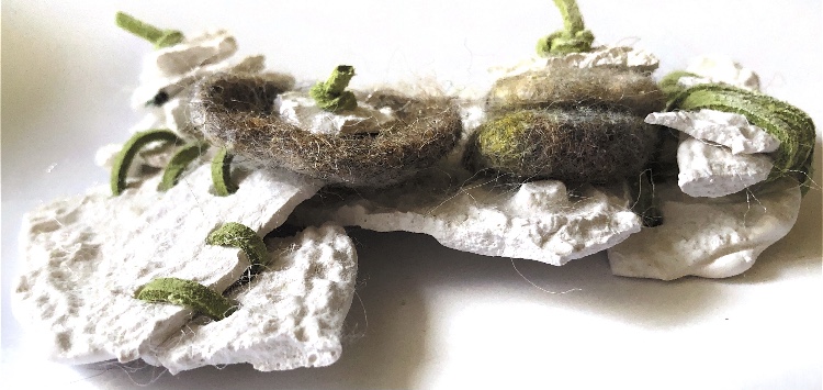 Following feedback from my tutor I decided to develop my collection of pieces from Part 5. The first thing I did was to add a bit of green watercolour to the small plaster sample, (Fig. 1) thereby tying it in with the other samples more closely. This can be seen in the group pictures. This small addition has made a huge difference to how the pieces fit together, I didn’t want to colour the cube but the plaster within the wire holds the colour really well for a subtle yet important splash of green.
